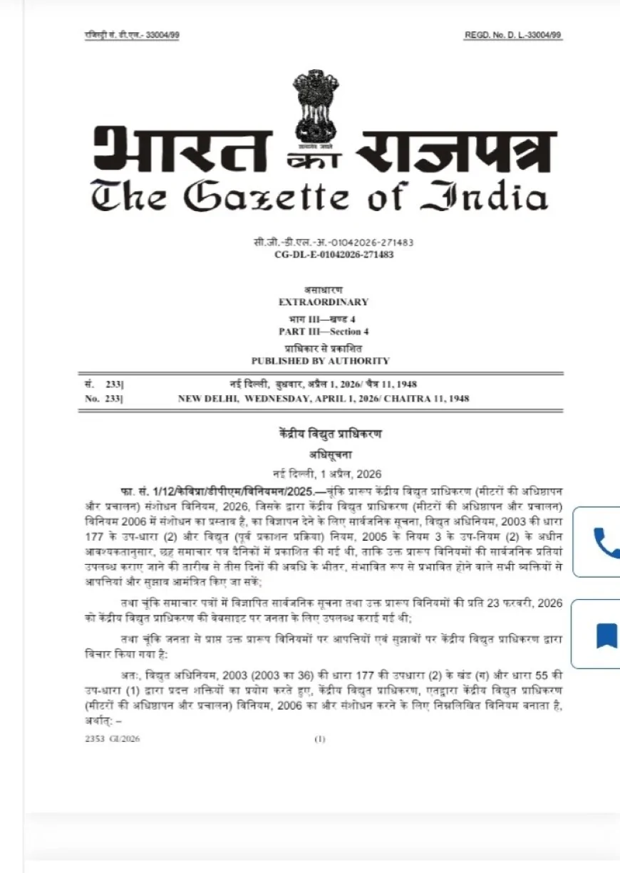 स्मार्ट मीटर को लेकर केंद्र सरकार ने बड़ा फैसला लेते हुए प्रीपेड अनिवार्यता समाप्त कर दी है। 1 अप्रैल 2026 को जारी नई अधिसूचना के अनुसार...