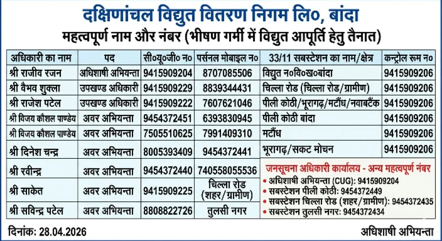 भीषण गर्मी और हीट-वेव के बीच बांदा में निर्बाध बिजली आपूर्ति की तैयारी; विभाग ने जारी किए कंट्रोल रूम और अधिकारियों के नंबर